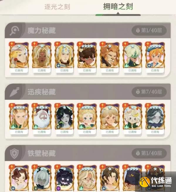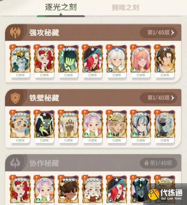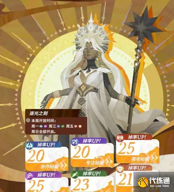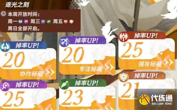 逐光之刻、擁暗之刻將隔天依次開放。周一至周六每天依次開放2個秘藏挑戰,每周日將開放指定主題的全部6個秘藏挑戰,即每兩周為一次完整循環。