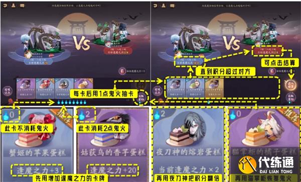 可以先用增加逢魔之力的基礎卡牌,再用夜刀神把積分翻倍,接著再用貓掌柜恢復鬼火,最后用1點鬼火抽卡,以此一直重復循環,注意計算鬼火消耗即可。