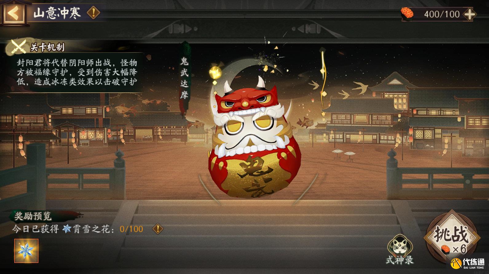 戰斗時封陽君將代替陰陽師與達摩對戰,在限定時間內造成怪物總血量20%的傷害后視為戰斗勝利,根據敵人剩余血量結算獎勵。