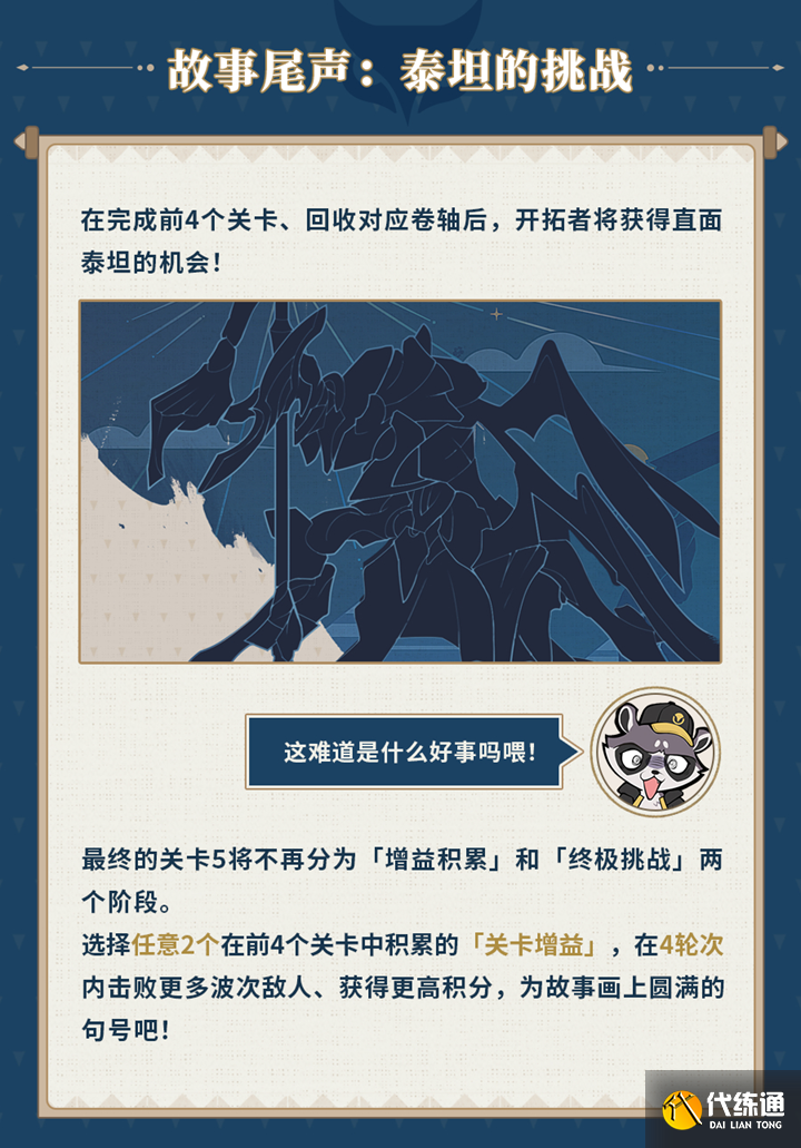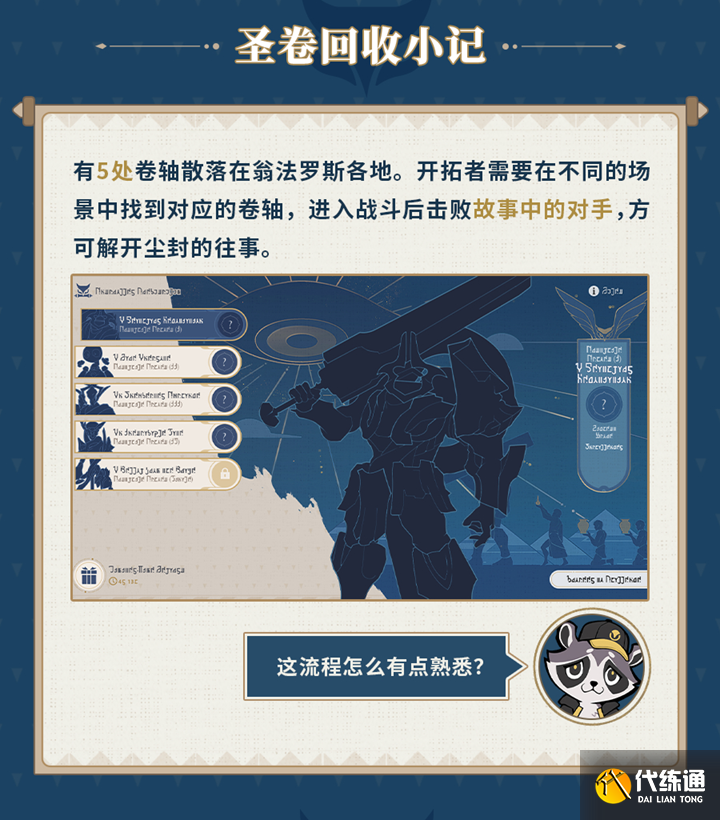 幫助烏拉尼婭回收5份散落在翁法羅斯的卷軸,擊敗敵人解鎖塵封往事,最終挑戰泰坦。
