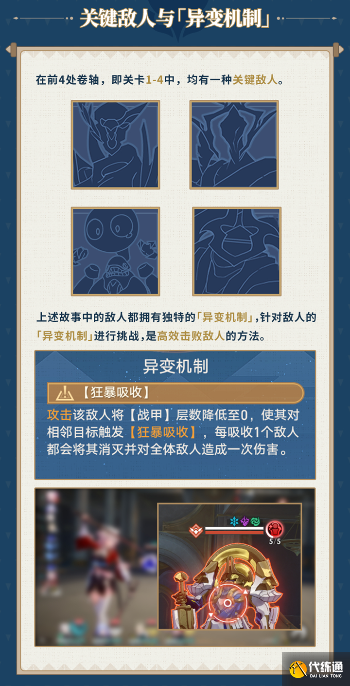 前4關(關卡1-4)中,每關均有1種攜帶【狂暴吸收】機制的關鍵敵人。