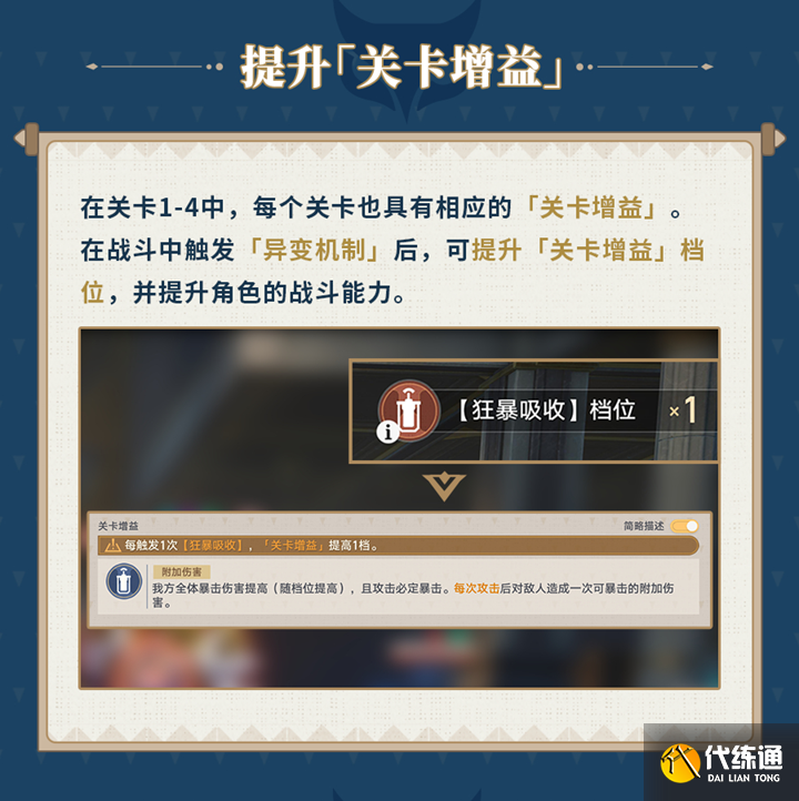 增益提升:每次觸發【狂暴吸收】,關卡增益提升1檔。