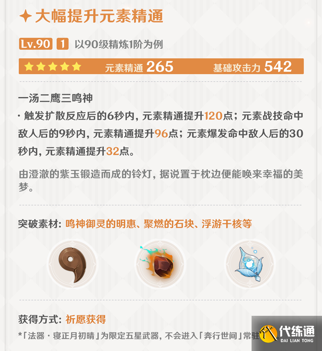 接下來是武器的獨特技能——“一湯二鷹三鳴神”,當觸發(fā)擴散反應后的6秒內(nèi),元素精通將提升120點;如果元素戰(zhàn)技命中敵人,則在接下來的9秒內(nèi),元素精通會額外提升96點;若元素爆發(fā)命中敵人后,則在接下來的30秒內(nèi),元素精通進一步提升32點。這意味著在實戰(zhàn)中,只要合理利用夢見月瑞希的技能組合,就能持續(xù)保持一個較高的元素精通加成狀態(tài),從而最大化地發(fā)揮出擴散反應的效果,并且還能通過擴散反應增強全隊的輸出能力。