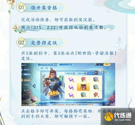 活動期間,玩家完成指定任務即可獲得刮獎次數,周六(2月15日、2月22日)可獲得雙倍刮獎次數。活動中共有3張刮刮卡,第3張必出“明世隱-景韶洛都”皮膚。每張刮刮卡的格子都有獎勵,開出當前刮刮卡的大獎即可解鎖下一張。