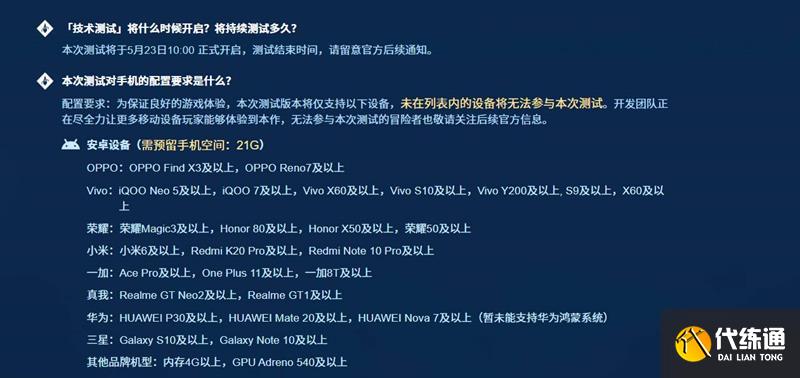 官方對為保證良好的游戲體驗,本次測試版本將僅支持以下設備,未在列表內的設備將無法參與本次測試。開發團隊正在盡全力讓更多移動設備玩家能夠體驗到本作,無法參與本次測試的冒險者也敬請關注后續官方信息。