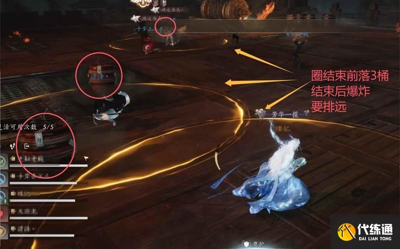 4.火海:火海一起,T立馬拉boss到地圖的最右側,也就是地上會有條黃線,黃線的另一側地上不燒傷害,然后不要管T,讓T自己卸容鳶去。其他所有人立馬?。?!把所有的連爆桶全搬開?。。?!只要不連就行!搬完就撤到T身邊,奶媽在火海起炸前后開水人技能,可以保住5個人的,只要不連炸,不去火海那一側。