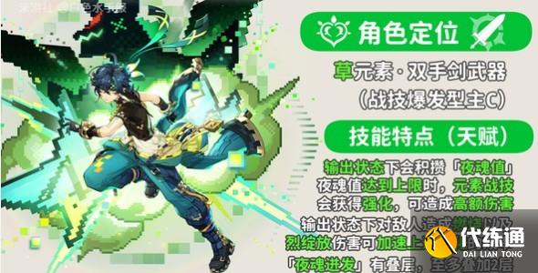 輸出狀態下會積攢「夜魂值!夜魂值達到上限時。元素戰技會獲得強化。可造成高額傷害輸出狀態下對敵人造成燃燒以及烈綻放傷害可加速上述強化的效率。「夜魂進發」有疊層,至多疊加2層,每層可為強化戰技加320%攻擊傷害