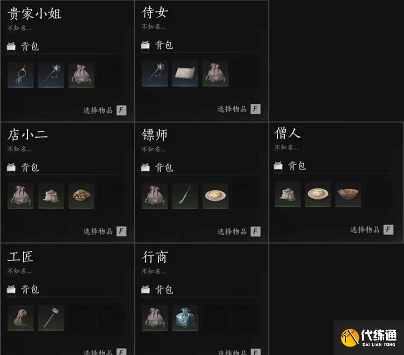 普通類∶鏢師,侍女,工匠,店小二,貴家小姐,行商,僧人