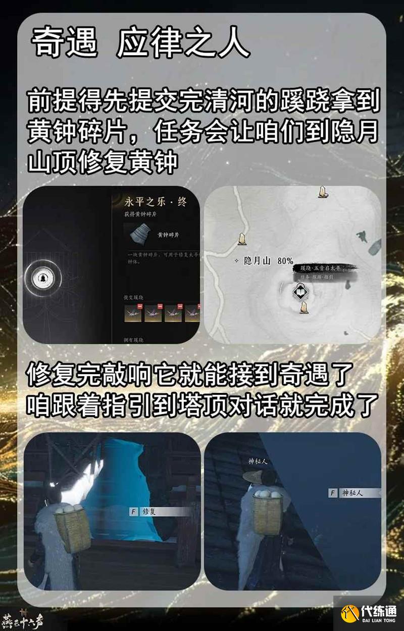 做起來也挺簡單的,不過前提得先提交完清河的蹊蹺拿到黃鐘碎片,任務會讓咱們到隱月山頂修復黃鐘,修復完敲響它就能接到奇遇了,咱們跟著任務指引就行,到塔頂對話能看見非常唯美的動畫就完成了。