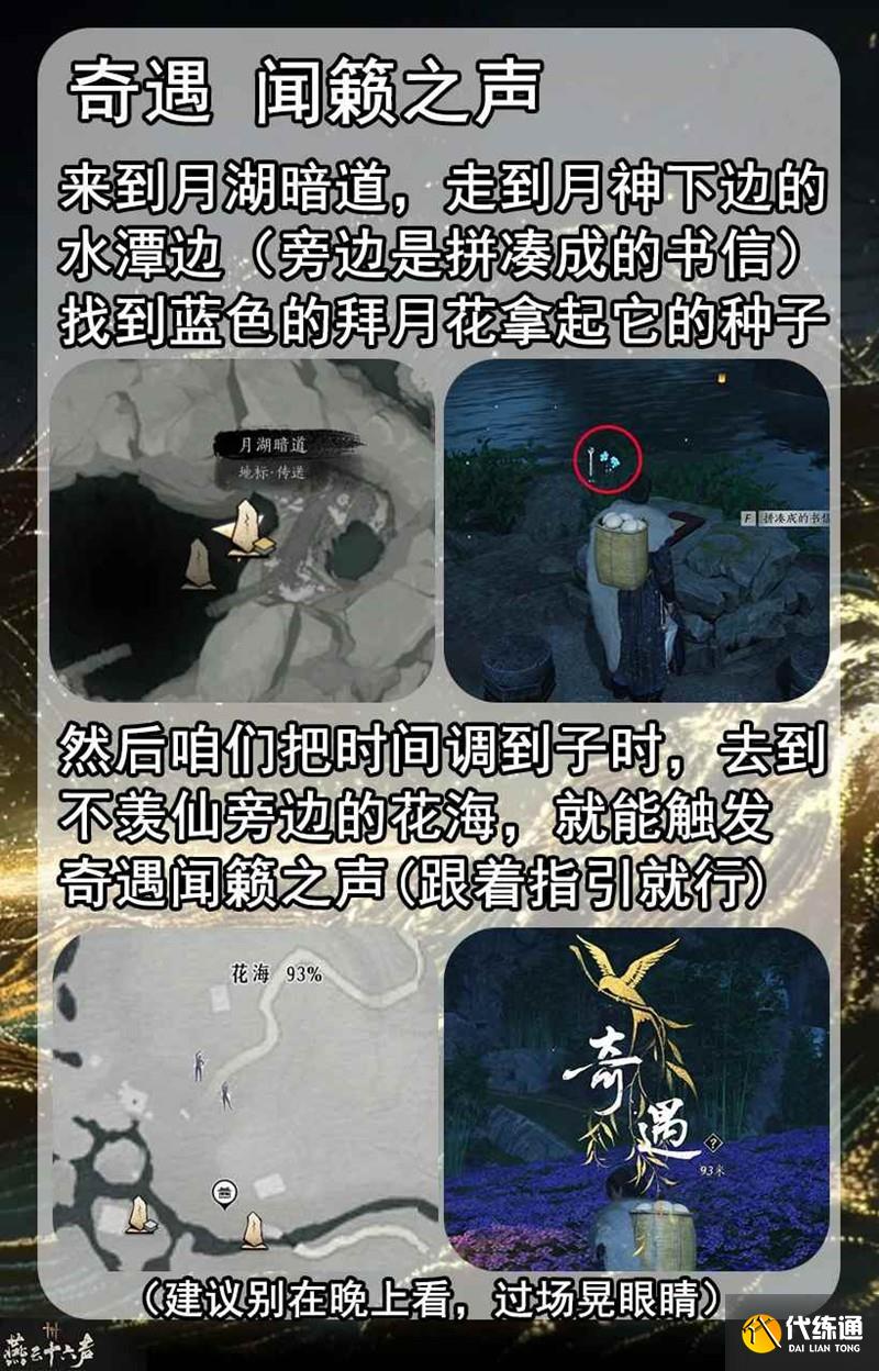 然后咱們把時間調到子時,去到不羨仙旁邊的花海,就能觸發奇遇聞籟之聲了,俺們也是跟著指引走就行了,是不是很簡單而且場景也非常好看嘞,不要忘記拍照噢!