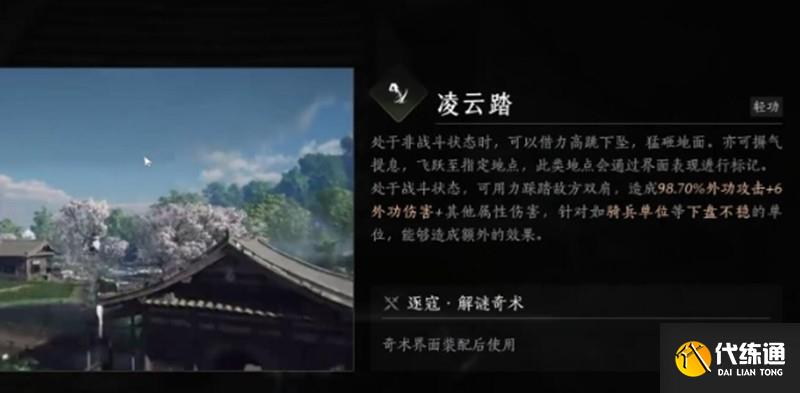 想要習得凌云踏這門輕功絕學,需要前往清河區域的將軍祠。從祠堂高處躍下后一路向前奔跑,在適當位置左轉繼續下落。到達底部后右轉沿樓梯上行,最終會在一座散發著哀傷氣息的雕像旁發現一具尸體,與之互動即可解鎖學習。