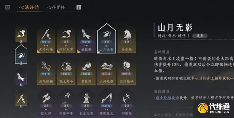 使用藍色品質的山月無影心法可以顯著提升刷取效率,特別是當心法突破到三重時效果更佳。這套組合能讓玩家在蓮花禪院據點快速刷怪,全程保持隱身狀態使用靈犀一指進行偷襲。心法三重效果會使每次偷襲都有概率獲得雙倍掉落,大幅增加金色狗糧的獲取量。