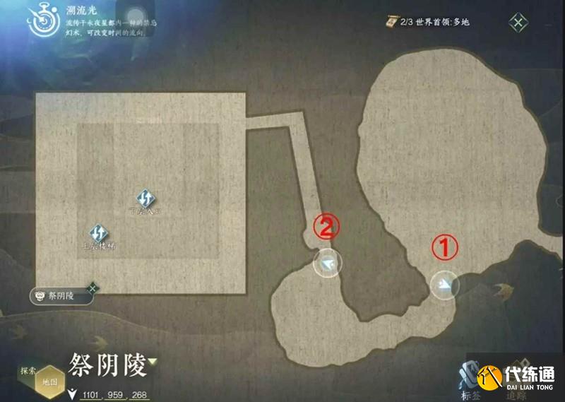 c. 進入祭陰陵(永夜星都,1195,962),第一個山洞的出口①在(1103,959),第二個山洞的出口②在(1047,969),點亮燈臺才可以開門。登上二樓后需要前往地圖內(896,1003)位置拾取線索。