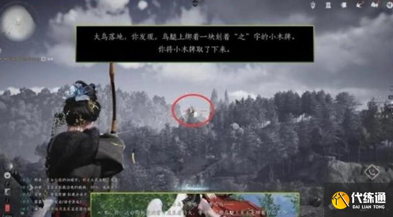 由于飛鳥高度較高,建議選擇射程較遠的弓箭,并預判飛行軌跡進行射擊。成功射落后,在鳥兒墜落處可以找到"之"字木牌。