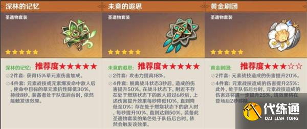 當前期資源有限或已有成型的【黃金劇團】套裝時,也可以暫時使用其作為過渡選擇。該套裝能顯著提升元素戰技傷害,對于依賴戰技的艾梅莉埃來說仍然有一定增益。但需注意,這套裝無法強化其固有天賦或爆發技傷害,適合早期使用,后續建議更換為前兩者之一。