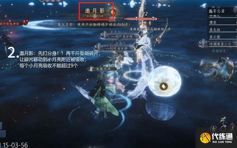 1.邀月影機制出來先打分身,再千金墜砸碎片(注意要往小月亮方向砸,且一個月亮只能吸收九個,超出會有一次全屏傷害,超兩個基本上就團滅了哦)