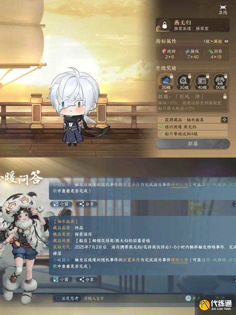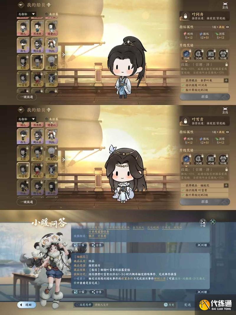 2.葉問舟/葉雪青:船只2級,游歷攜帶1-3小時內(nèi)觸發(fā)特殊事件,完成概率掉落