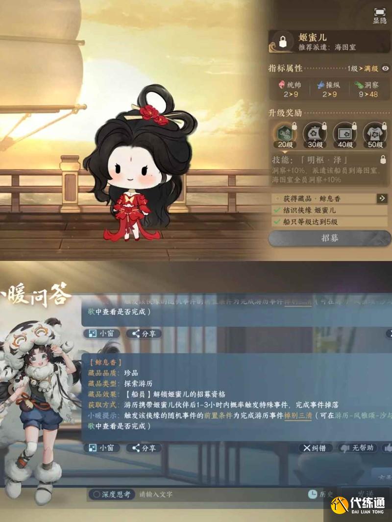 5.姬蜜兒:船只5級,游歷攜帶1-3小時內(nèi)觸發(fā)特殊事件,完成概率掉落