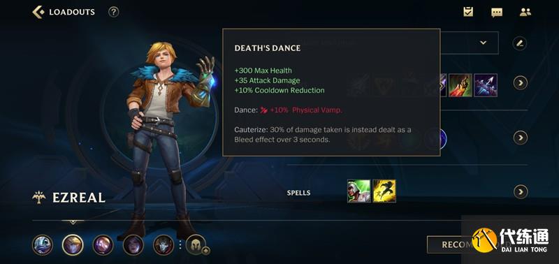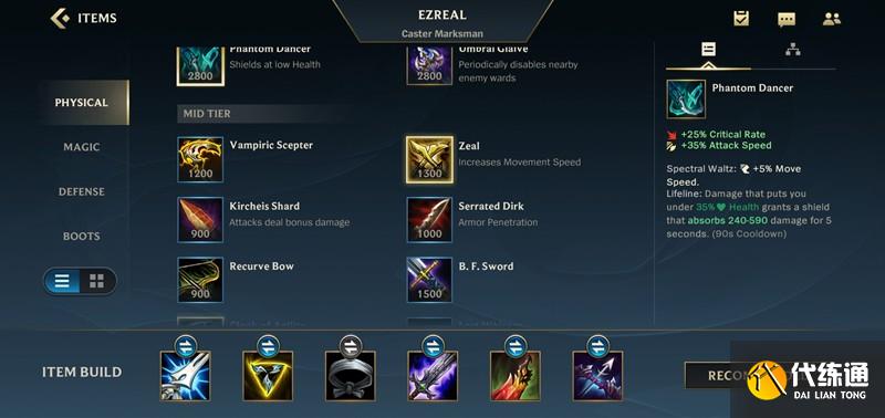 死亡之舞和幻影之舞的選擇取決于戰(zhàn)局情況。順風(fēng)時幻影之舞的攻速和暴擊加成能進(jìn)一步提升輸出,其被動護(hù)盾也能提供不錯的保護(hù)。逆風(fēng)時則推薦死亡之舞,這件裝備的減傷和回血效果能顯著提高EZ的生存能力。