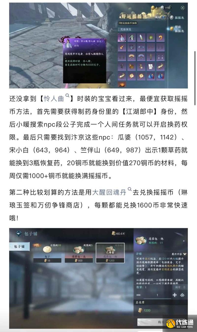 還沒拿到【憐人曲】時裝的寶寶看過來,最便宜獲取搖搖幣方法,首先需要獲得制藥身份里的【江湖郎中】身份,然后小暖搜索npc段公子完成一個人間任務就可以開啟換藥權限。最后只需要找到汴京這些npc:瓜婆(1057,1142)、宋小白(643,964)、竺伴山(649,987)出示1顆草藥就能換到3瓶恢復藥,20銅幣就能換到價值270銅幣的材料,每周僅需1000+銅幣就能換滿搖搖幣。