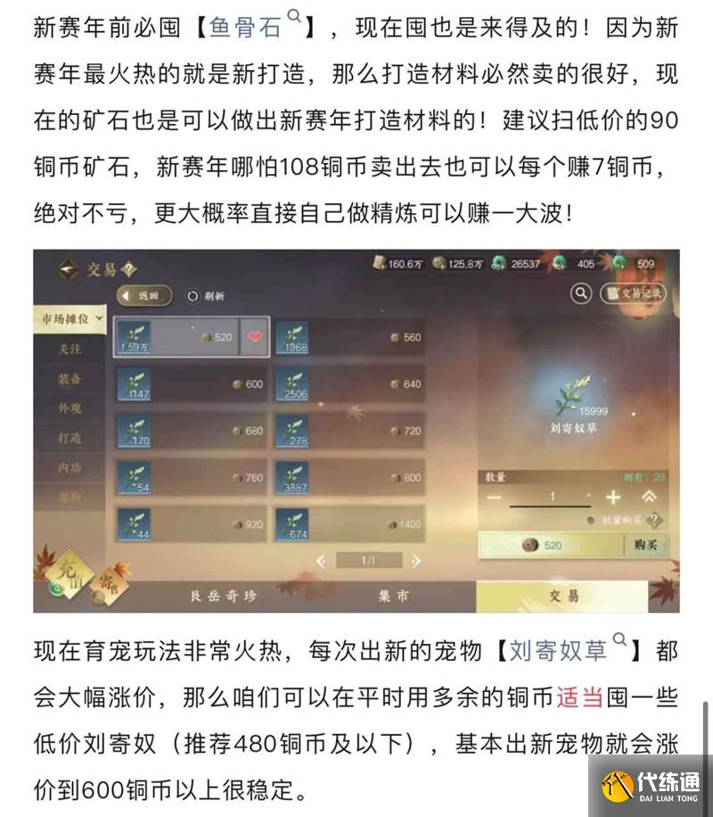 現在育寵玩法非常火熱,每次出新的寵物【劉寄奴草】都會大幅漲價,那么咱們可以在平時用多余的銅幣適當囤一些低價劉寄奴(推薦480銅幣及以下),基本出新寵物就會漲價到600銅幣以上很穩定。