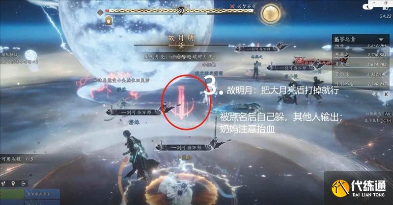 BOSS進入50%血量,場中升起【碩大圓月】。所有人集火圓月,同時【不要觸碰】地上掉落的【彎月】,彎月會給護盾回血,打半天還不如回的多,圖啥。