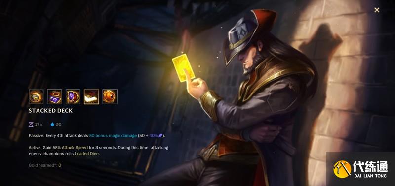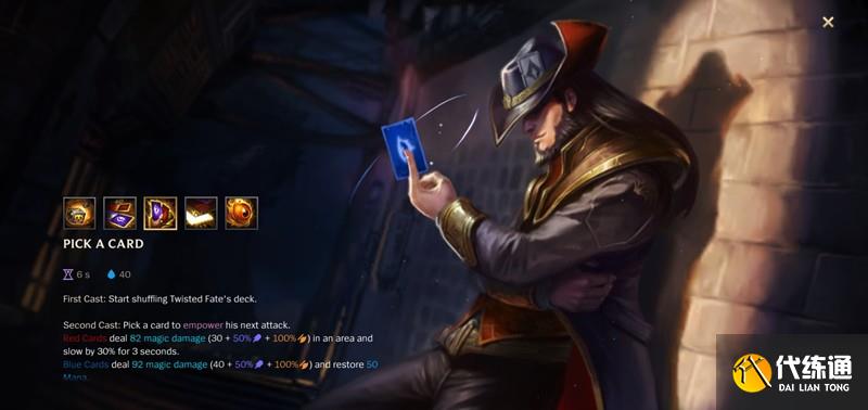 被動提升卡牌大師的攻擊速度,并且每四次普通攻擊會造成額外魔法傷害。這個技能增強了卡牌的持續(xù)輸出能力,配合W技能可以打出不錯的爆發(fā)。