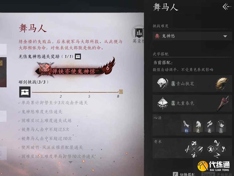 燕云十六聲游戲允許專注于“東方武俠世界中存在的各種身份和職業(yè)”。游戲中會有多種不同的玩法風(fēng)格,如劍術(shù)、武技、甚至是太極等,可以混合搭配劍法、近身戰(zhàn)等來戰(zhàn)斗。游戲中挑戰(zhàn)成功試煉鬼神愁無傷通關(guān)就可獲得帥氣稱號,那么舞馬人應(yīng)該怎樣逃課呢?小編為你準(zhǔn)備了一份攻略,一起來看看吧~