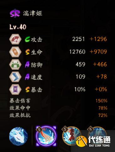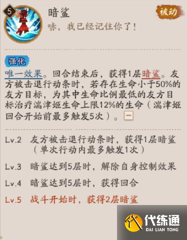 唯一效果。回合結束后,獲得1層暗鯊。友方被擊退行動條時,若存在生命小于50%的友方目標,為其中生命比例最低的友方目標治療湍津姬生命上限12%的生命(湍津姬回合開始前最多觸發5次)。