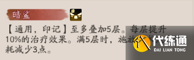 【通用,印記】至多疊加5層。每層提升10%的治療效果。滿5層時,施放妖術鬼火消耗減少3點。