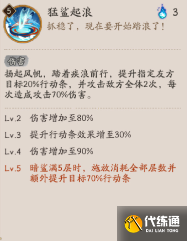 Lv.5 暗鯊滿5層時(shí),施放消耗全部層數(shù)并額外提升目標(biāo)70%行動(dòng)條