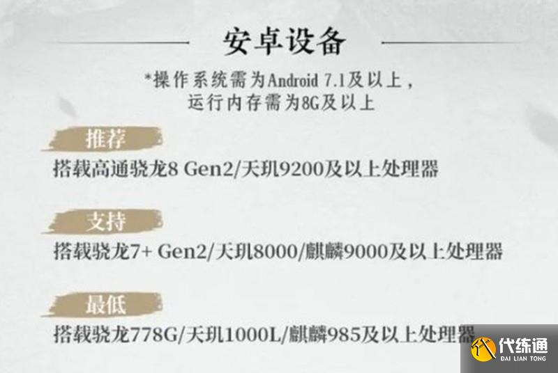 安卓設備玩家需要驍龍778G或麒麟985及以上處理器,運行內存8GB起步,系統版本需Android 7.1以上。iOS玩家則需要iPhone11(A13芯片)及以上機型,系統版本要求iOS15以上。這些配置能保證燕云十六聲在移動設備上的基本流暢運行。