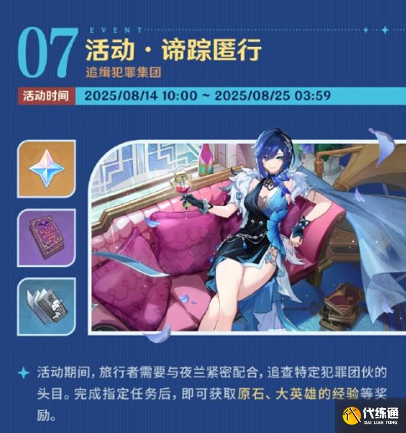 活動說明:活動期間,旅行者需要與夜蘭緊密配合,追查特定犯罪團伙的頭目。完成指定任務后,即可獲取原石、大英雄的經驗等獎勵。