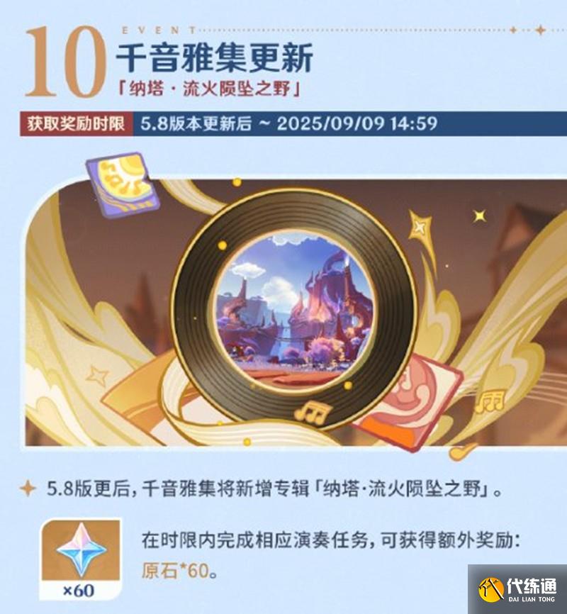 活動說明:5.8版更后,千音雅集將新增專輯「納塔·流火隕墜之野」。在時限內完成相應演奏任務,可獲得額外獎勵:原石*60。