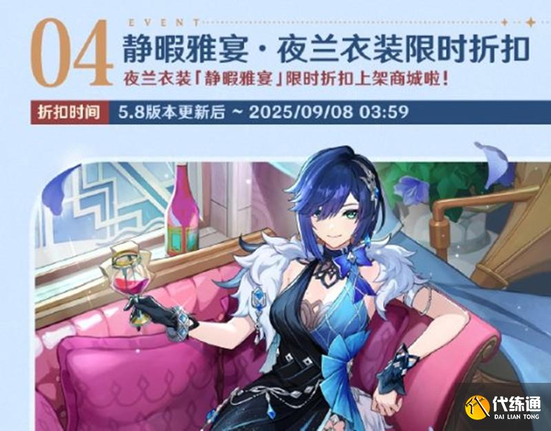 活動內容:夜蘭衣裝「靜暇雅宴」限時折扣上架商城。折扣期間衣裝售價為1350創世結晶,限時折扣結束后價格將恢復至1680創世結晶。上架期間限購1次。