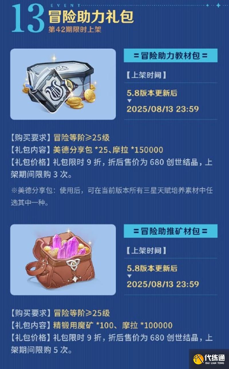 冒險助力教材包:禮包內容為美德分享包25、摩拉150000,折后售價為680創世結晶,上架期間限購3次。