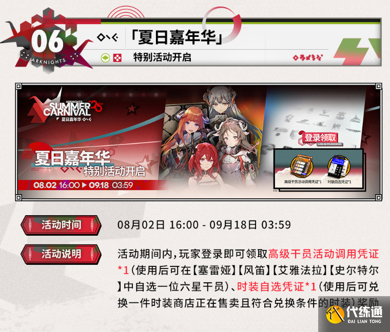 「夏日嘉年華」,特別活動開啟,時間:8.2~8.16,六星干員自選,包括風笛、塞雷婭、42姐和小綿羊,同時還有一張皮膚自選券。