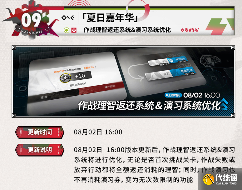 「夏日嘉年華」,作戰理智返還系統&演習系統優化,不再消耗演習券,同時失敗或者退出全部返還理智。