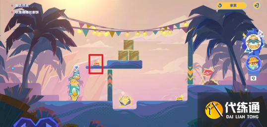 切換到小矮子,操作小矮子把平臺上方的三個箱子推到下層,然后調(diào)整大個子的位置,把箱子推到黃色按鈕上,移開第二個擋板。
