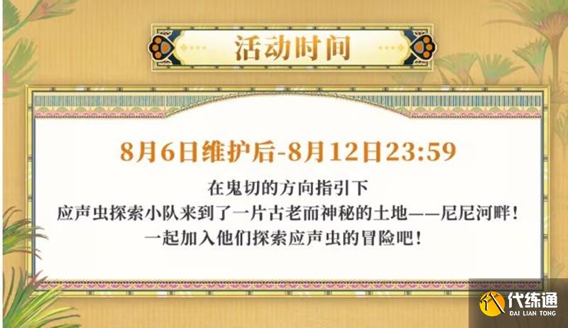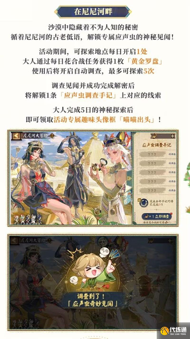 活動期間,玩家可以探索尼尼河畔的沙漠中隱藏的秘密。通過每日花合戰任務獲得1枚“黃金羅盤”,使用后將開啟自動調查,最多可探索5次。調查見聞并成功完成解密后,將解鎖1條“應聲蟲調查手記”上的對應線索。完成5日的神秘探索后,玩家即可領取活動專屬趣味頭像框“喵喵出頭”。