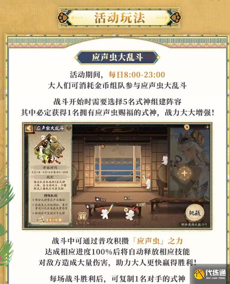 活動期間,每日8:00-23:00,玩家可以消耗金幣組隊參與應聲蟲大亂斗。戰斗開始時,玩家需要選擇5名式神組建陣容,其中必須包含1名擁有應聲蟲賜福的式神,以增強戰斗力。