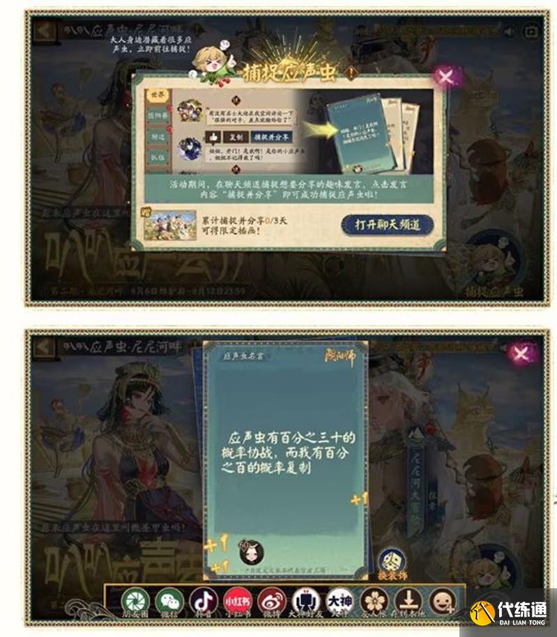 玩家可以通過點擊“前往捕捉”按鈕,自動打開“頻道”,對其他玩家及自己所發布內容點擊使用“應聲蟲分享”,生成一段趣味應聲蟲名片。每日分享1次應聲蟲名言名片,累計分享3次即可領取活動插畫“懸沙溯金”。