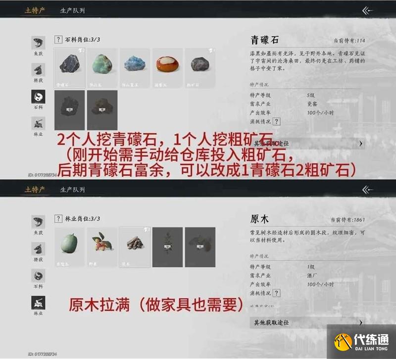 2.礦石供應:經過計算,3個礦工僅能供應2條燒瓷隊列,這3個礦工呢,又必須分成兩組挖兩種不同的石頭,所以理論上,需要1個礦工在兩種石頭之間反復橫跳,才能持續供應2條燒瓷隊列。這樣太麻煩了,所以先自掏腰包投入一些粗礦石吧。2條隊列燒的酒瓶后期會溢出,可以停工1條用來囤積礦石,讓老鄉去養老居睡覺吧!