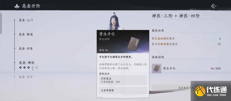 [懸壺升級]少東家提高懸壺造詣需要營生手記,目前營生手記只能在不肝商店購買,還有在大世界探索中能獲取少量手記。每周刷新500本。通過營生手記能升級懸壺等級提高懸壺造詣。