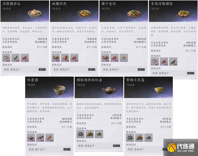 備席:賣7級酒和今日熱賣菜肴,曲香坊:7級酒,瓷窯:銅胎陶膽松紋壺,釣魚:河豚,狩獵:豬肉,挖礦:黃銅、粗礦石,林業:必選原木,其他隨意