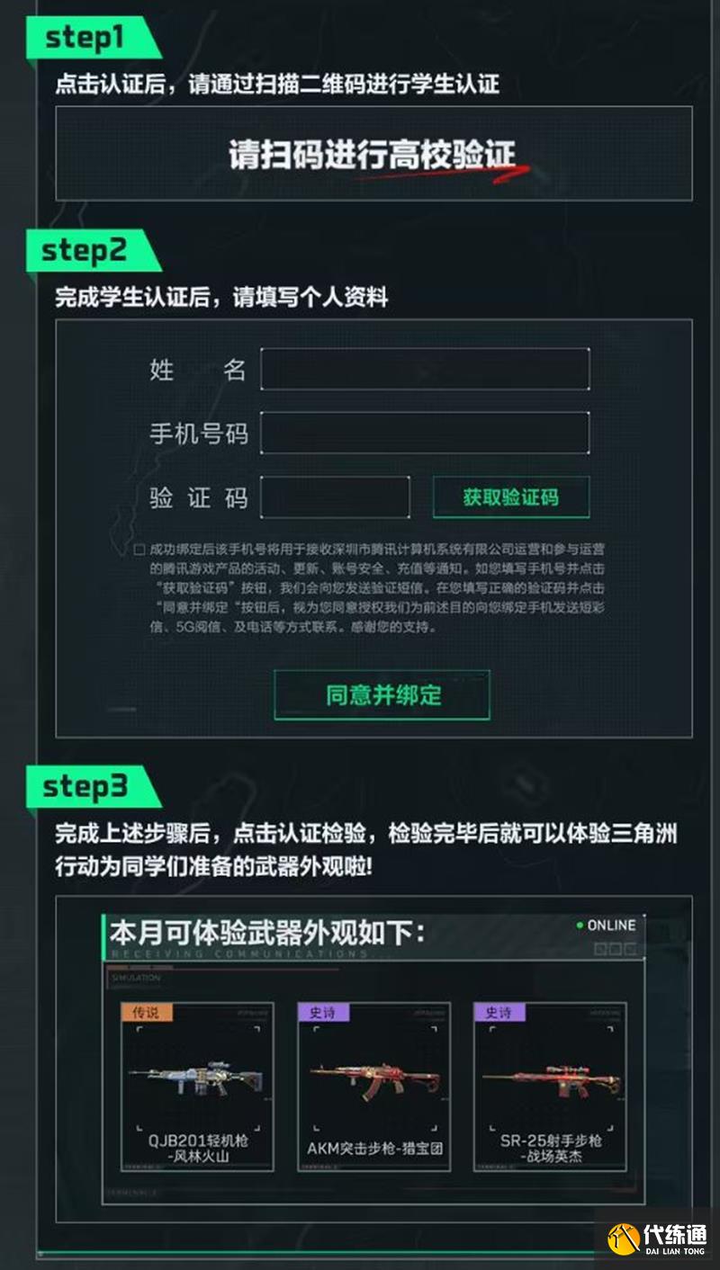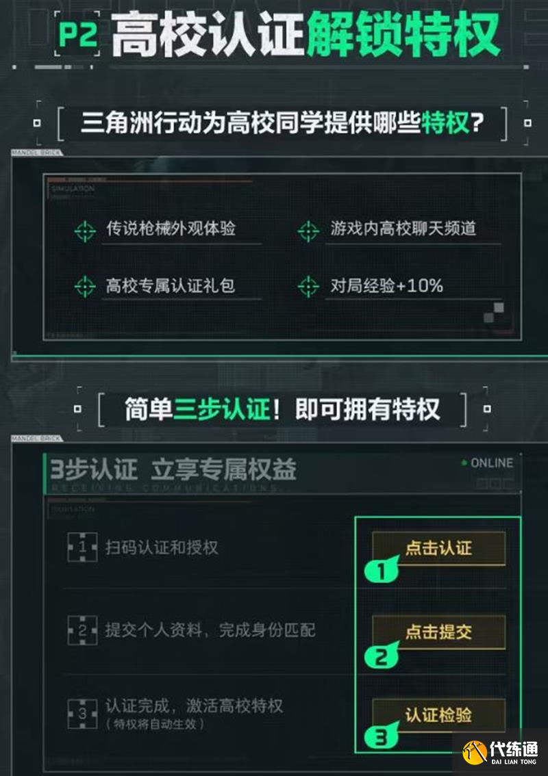 完成高校認證后,您可以解鎖包括傳說槍械外觀體驗、游戲內高校聊天頻道、高校專屬認證禮包以及對局經驗+10%等特權。