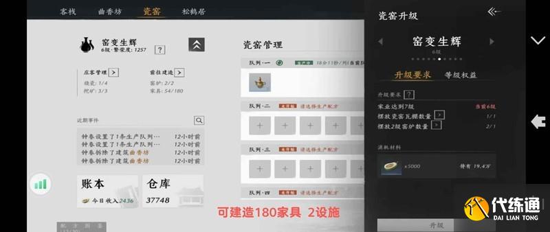 不羨仙、曲香坊、瓷窯各可建造180個家具(含房屋、結構、裝飾) 升級需5000囤囤粟