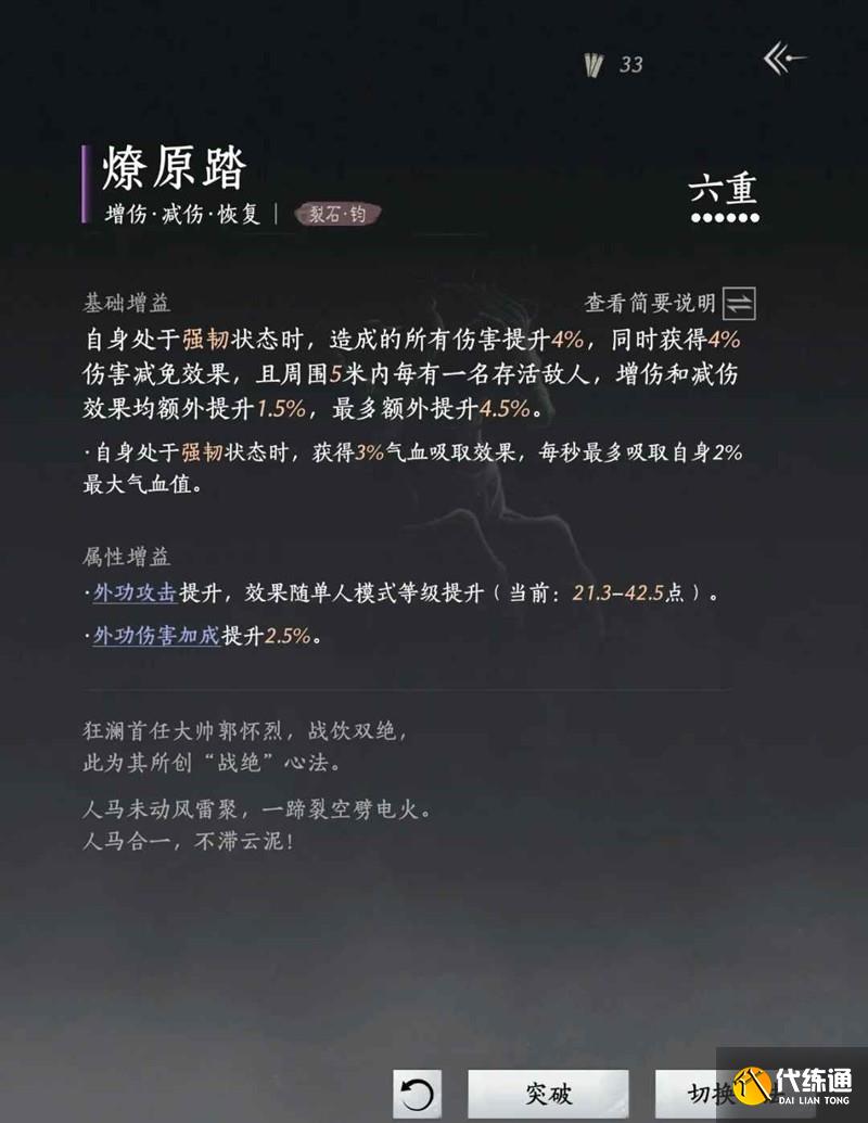 【長(zhǎng)生無相:如果你的心法養(yǎng)成進(jìn)度很低,一重長(zhǎng)生的卸勢(shì)回真氣能在很多時(shí)候?yàn)槟銧?zhēng)取一個(gè)不被處決打機(jī)會(huì)】心法儲(chǔ)備以及裝備養(yǎng)成足夠就不建議帶,尤其是止戈定音出卸勢(shì)回真氣時(shí),長(zhǎng)生更顯得雞肋。