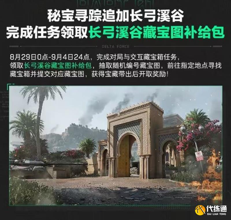 從8月29日0點(diǎn)至9月4日24點(diǎn),玩家可以通過(guò)完成對(duì)局和交互藏寶箱任務(wù),領(lǐng)取長(zhǎng)弓溪谷藏寶圖補(bǔ)給包,并有機(jī)會(huì)抽取隨機(jī)編號(hào)藏寶圖,前往指定地點(diǎn)尋找藏寶箱并提交對(duì)應(yīng)藏寶圖,獲得寶藏后可開(kāi)啟獎(jiǎng)勵(lì)。
