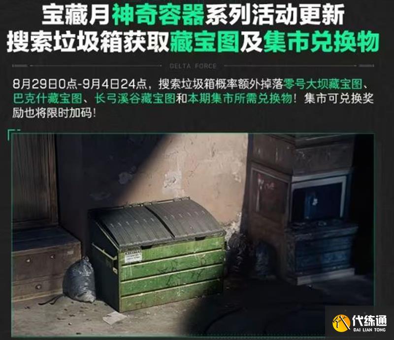 8月29日0點(diǎn)至9月4日24點(diǎn),玩家搜索垃圾箱將概率額外掉落零號(hào)大壩藏寶圖、巴克什藏寶圖、長(zhǎng)弓溪谷藏寶圖和本期集市所需兌換物,集市可兌換獎(jiǎng)勵(lì)也將限時(shí)加碼。